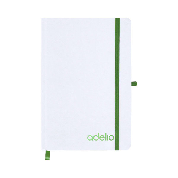 Notizblock mit steifen weißen Einbänden aus recyceltem Karton. Innenraum mit 80 verfügbaren Blättern für einen Streifen. Enthält ein Lesezeichen, in derselben Farbe wie elastisches Verschlussband und Stifthalter. Spezial für Lasergravuren, die die ausgewählte Farbe zeigt.