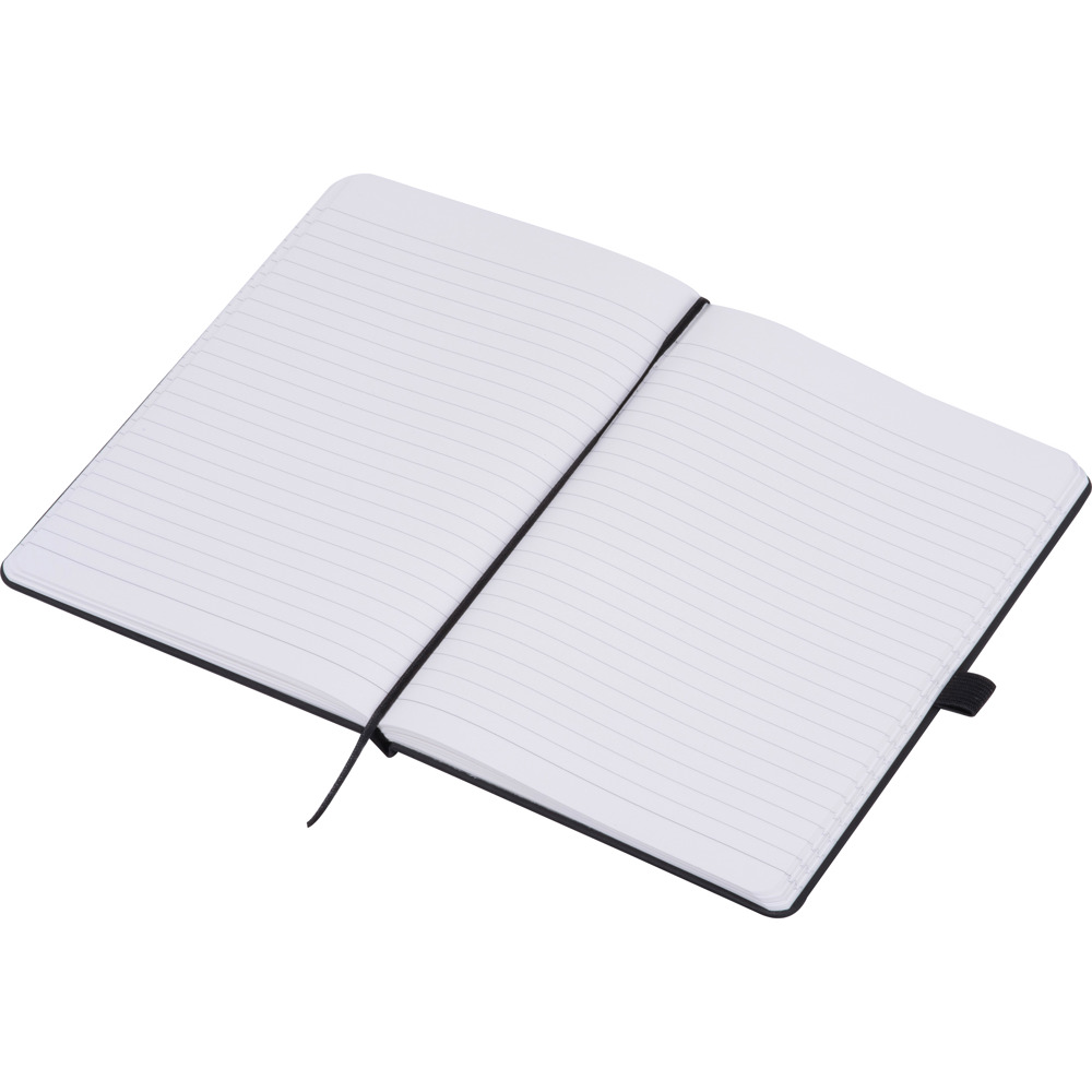 A5 Notizbuch mit PU-Einband, Lesezeichen, Verschlussband, Kugelschreiberschlaufe und 120 linierten Seiten aus Steinpapier. Dieses besondere Papier besteht aus Calciumcarbonat und ist öl- und wasserresistent, antistatisch, schwer entflammbar, nicht körnig und vorallem reißfest. Ihre Werbung drucken wir außen auf das Cover.