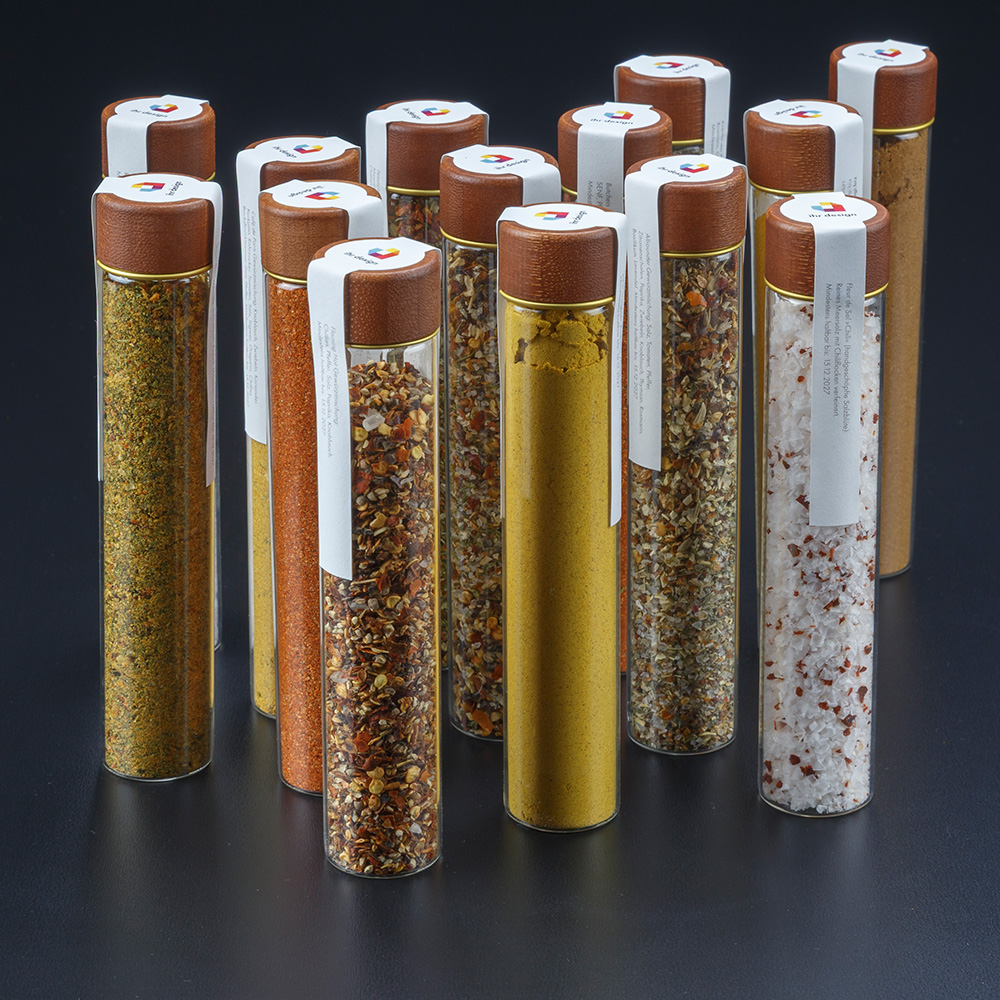 Der Würzglück – Aromazylinder Business ist die vielseitige Business-Edition innerhalb der Aromazylinder-Serie. Gefertigt aus hochwertigem Borosilikatglas und ausgestattet mit einem designstarken Schraubverschluss inklusive auslaufsicherer Dichtung, verbindet er moderne Ästhetik mit funktionaler Qualität. Inhaltlich bietet die Business-Variante maximale Flexibilität: Von würzigen BBQ-Klassikern wie Butcher’s Hack, Magic Dust oder Fetalicious über Café de Paris bis hin zu Golden Milk oder Ingwer-Kompositionen. Damit eignet sich der Aromazylinder Business ideal für Markenauftritte, Events, Mitarbeitendengeschenke oder Kundenaktionen. Sein reduziertes, zeitloses Design passt zu nahezu jedem Anlass und macht den Aromazylinder Business zu einem hochwertigen, modernen Genussprodukt mit starkem Werbecharakter.