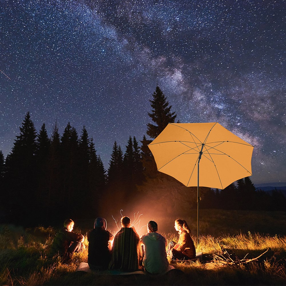 Moderner Sonnenschirm mit Gestell in Titan-Finish und Knickvorrichtung Einfache Handhabung durch Sicherheitsschieber, sehr stabile Fiberglasschienen, zweiteiliger und stufenlos höhenverstellbarer Stock mit Knickvorrichtung zur Neigung des Schirms, Stock in edlem Titan-Finish, Unterstock mit ca. 120 cm Länge und Drehfeststeller zur sicheren Fixierung, komfortables Tragefutteral, hochqualitativer Bezug mit einer Grammatur von ca. 200 g/m² und Lichtschutzfaktor UPF 50+, exklusive Füllständer (Art. 8920 oder Art. 8905) / Erdspieß (Art. 8939)