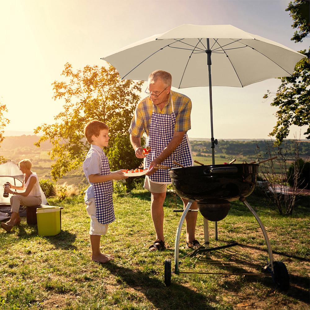 Moderner Sonnenschirm mit Gestell in Titan-Finish und Knickvorrichtung Einfache Handhabung durch Sicherheitsschieber, sehr stabile Fiberglasschienen, zweiteiliger und stufenlos höhenverstellbarer Stock mit Knickvorrichtung zur Neigung des Schirms, Schienen und Stock in edlem Titan-Finish, Unterstock mit ca. 125 cm Länge und Drehfeststeller zur sicheren Fixierung, komfortables Tragefutteral, hochqualitativer Bezug mit einer Grammatur von ca. 200 g/m² und Lichtschutzfaktor UPF 50+, überlappender Ventilationsbezug zur Regulierung von Überdruck durch stärkere Windböen, exklusive Füllständer (Art. 8920)