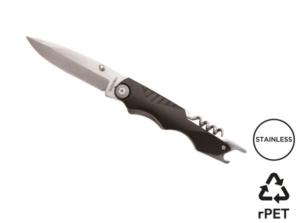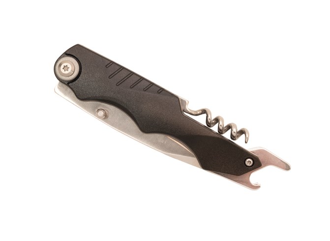 Klappbares Messer mit Klinge aus rostfreiem 420er Edelstahl. Montage mit Torx-Schrauben. Griff aus Aluminium und rostfreiem Edelstahl. Integrierter Flaschenöffner und Korkenzieher mit vier Spiralen. Einhändiges Öffnen/ Schließen mit einem Liner-Lock-Sicherheitsmechanismus. Wird in einem melierten grauen Etui aus RPET geliefert.