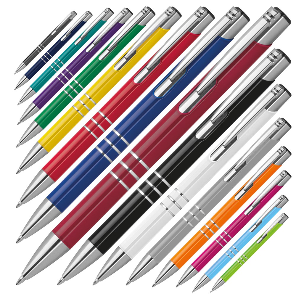 TOP PRICE! Farbig lackierter Kugelschreiber aus Metall mit 3 Zierringen und blauschreibender Großraummine. Die Werbung wird mittels Gravur rechts vom Clip angebracht.