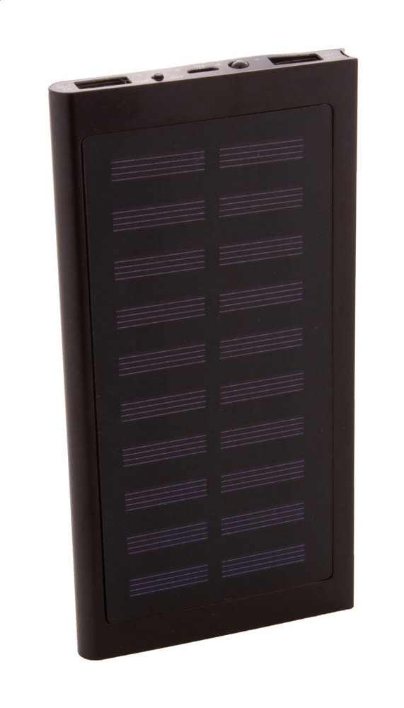 Powerbank im Gehäuse aus recyceltem Aluminium mit integriertem Solarladegerät und 4000-mAh-Akku. Mit 2 USB- und 1 USB-C-Ladeanschlüssen. USB-C-Eingangsport. Inklusive USB-Ladekabel.