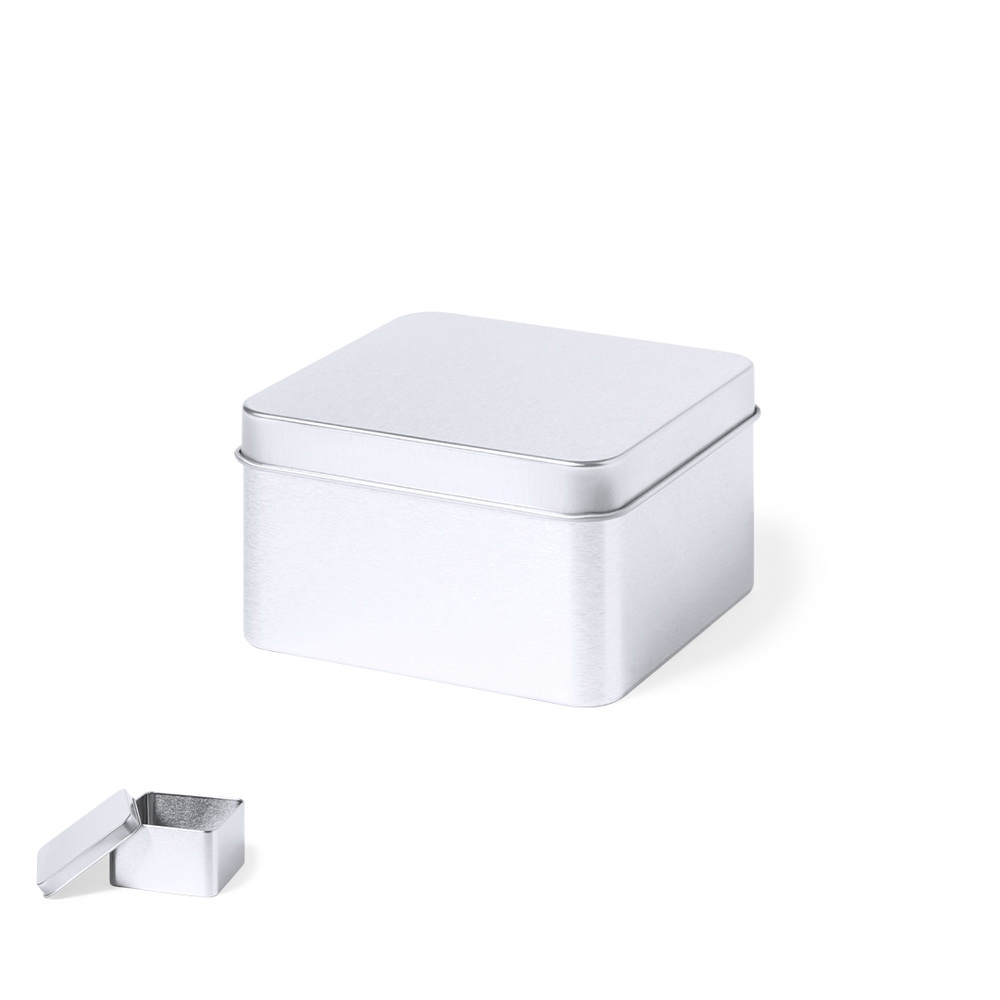 Quadratische Präsentationsbox aus robustem, silberfarbenem Metall mit passendem Deckel.