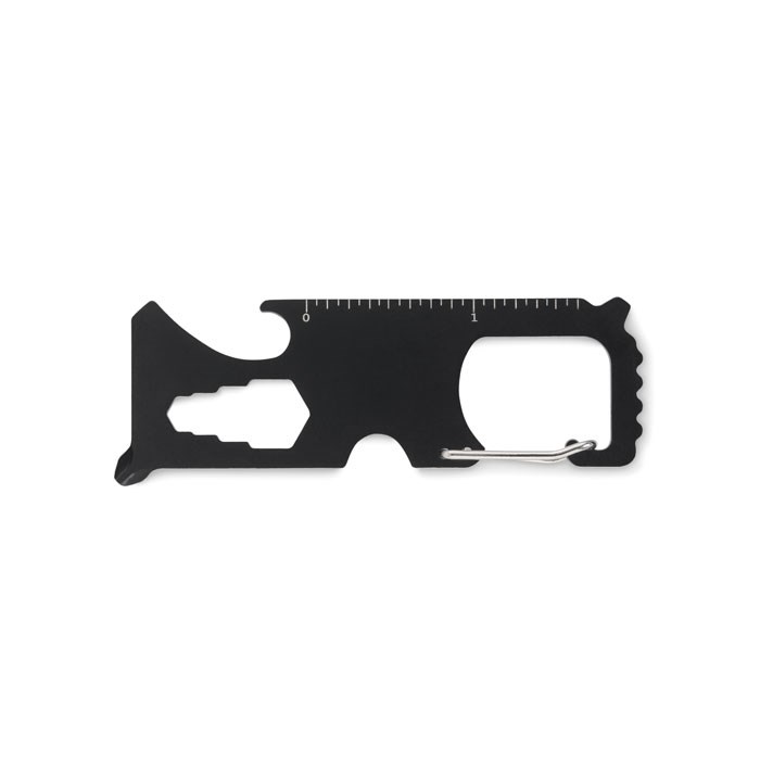 Kleines Multifunktionswerkzeug aus Edelstahl. Mit 8 Funktionen: Säge, Kabelschneider, Schraubschlüssel, Kreuzschlitzschraubendreher, Schlitzschraubendreher, Lineal, Kapselheber und Schlüsselring.