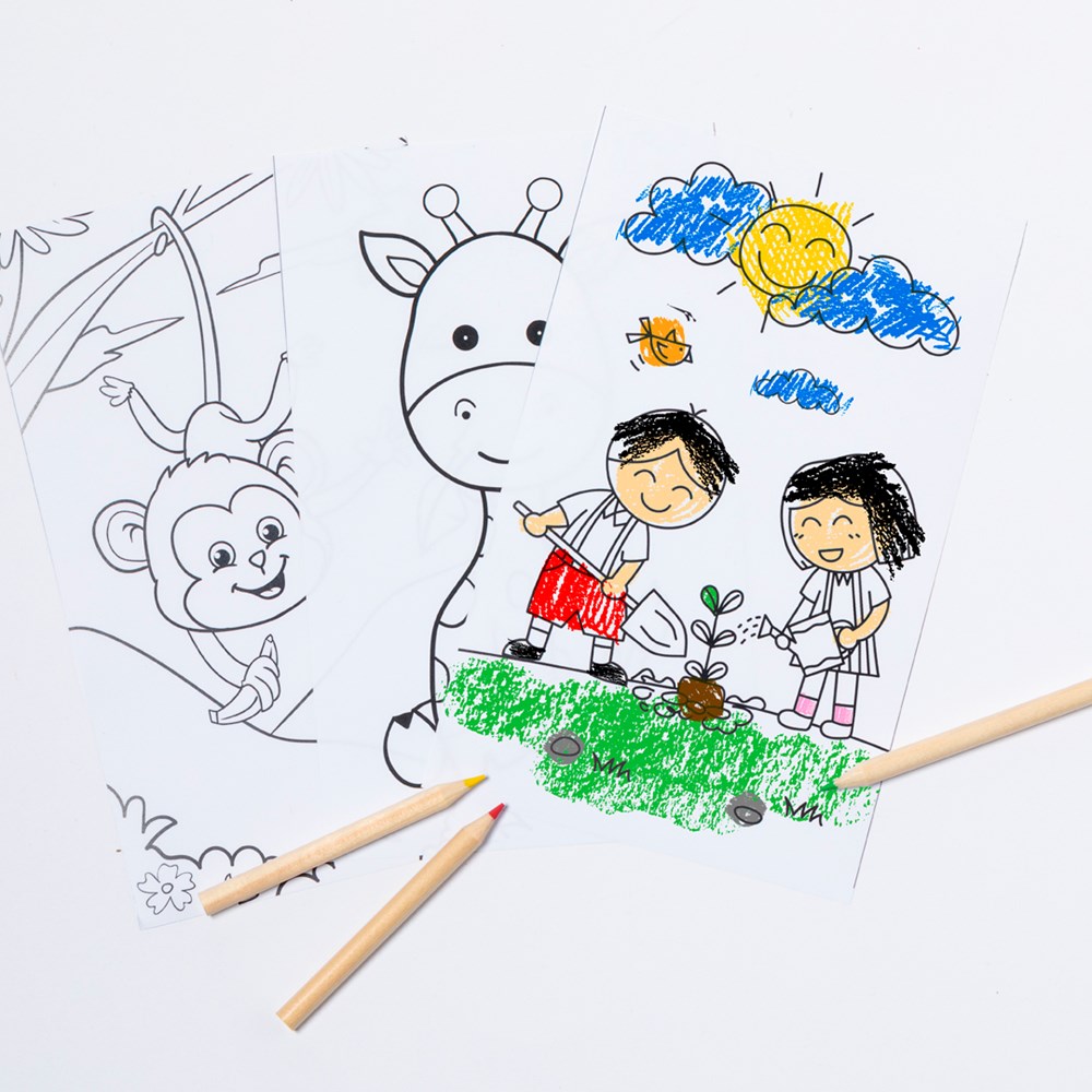 Malset aus recyceltem Karton. Inklusive einem verspielten Satz Zeichnungen und Buntstiften in einer praktischen Mappe mit Griffen. Inhalt: 20-Blatt-Block mit Naturzeichnungen zum Ausmalen. Box mit 6 Holzstiften in verschiedenen Farben. Anspitzer. Radiergummi.