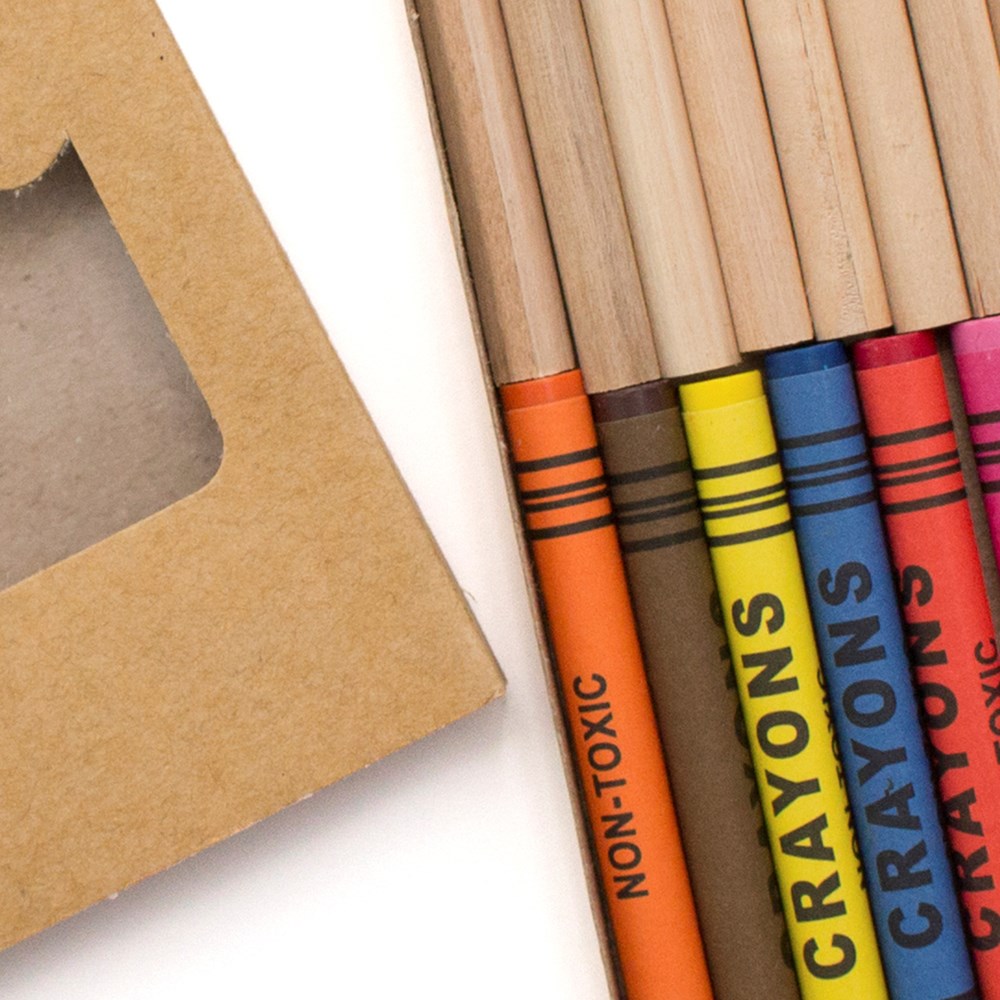 19-teiliges Set in einer Schachtel aus Naturkarton mit Fenster und herausnehmbarem Fach. Enthält Wachsmalstifte mit zylinderförmigem Schaft und Bunstifte aus Naturholz mit sechseckigem Schaft in verschiedenen Farben.
