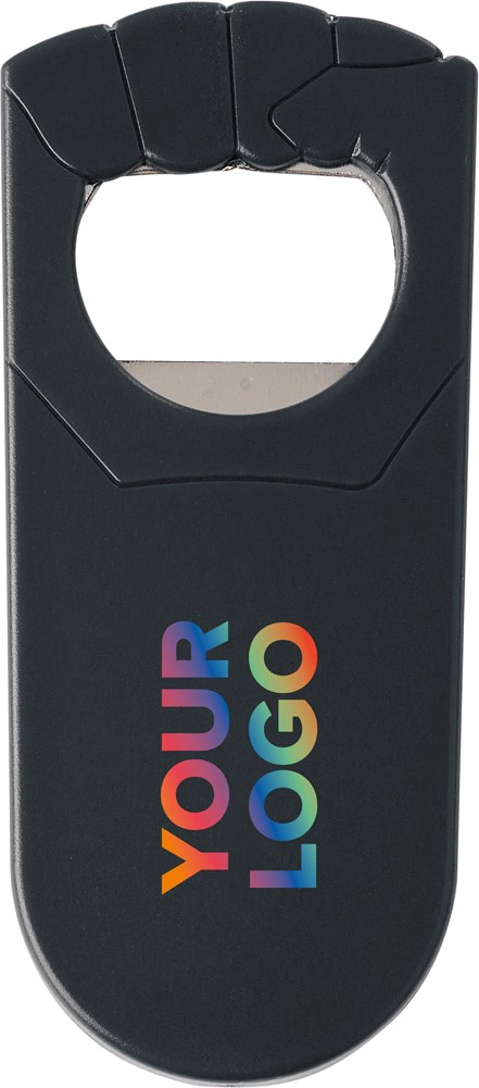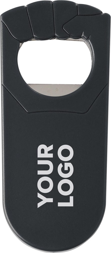 Flaschenöffner aus Kunststoff und Metall, in Form einer Faust. mehr