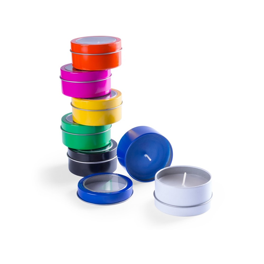 Aromakerze mit Vanilleduft. Präsentiert in einer originellen Metalldose in verschiedenen kräftigen Farben mit transparentem Fenster.