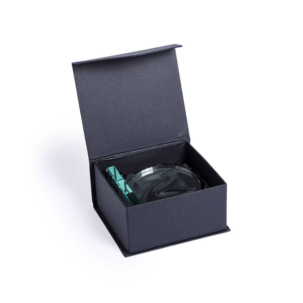 Trophäe aus dickem Glas mit elegantem, rundem Design und quadratischem Standbein. Speziell für den Laserdruck entwickelt. Präsentiert in einem individuellen Schutzcase.