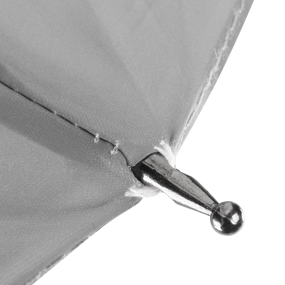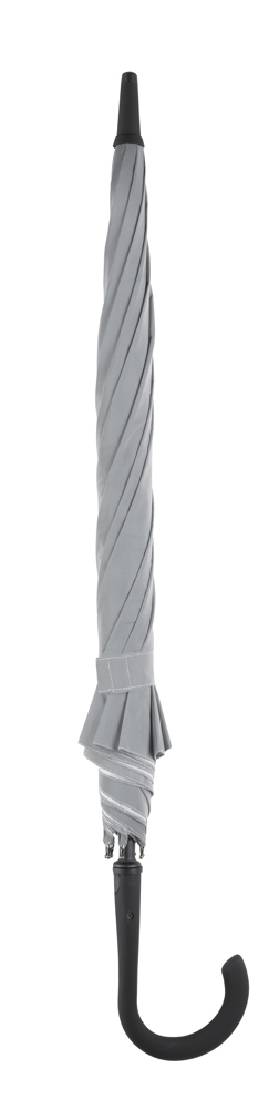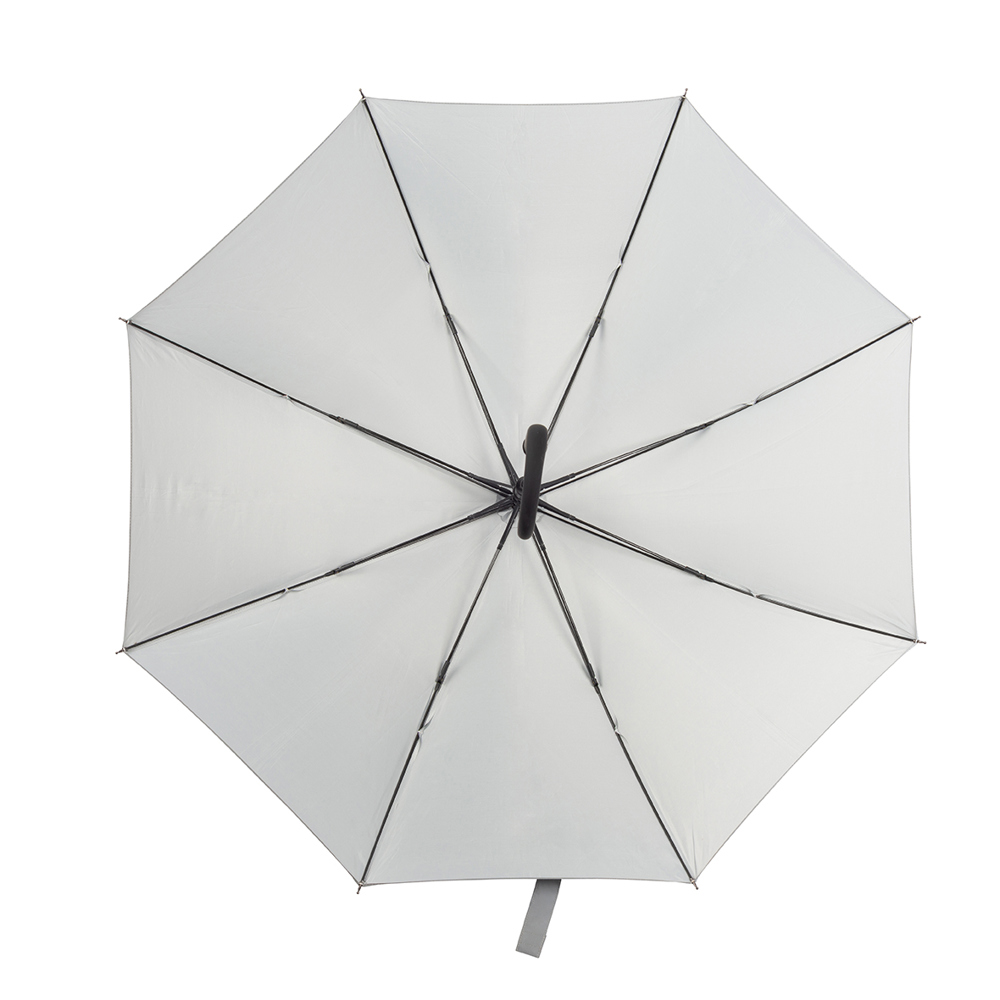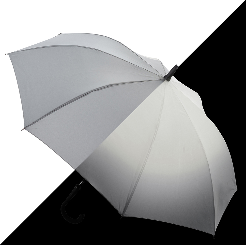 Der Regenschirm hat eine Bespannung aus reflektierendem Material und einen Durchmesser von ca. 102 cm. Im geschlossenen Zustand misst er ca. 83 cm in der Länge. Der Schirm verfügt über eine Automatikfunktion und besteht aus 8 Segmenten. Zusätzlich ist er mit einer Windproof-Funktion ausgestattet und hat einen gummierten Rundgriff in Schwarz.