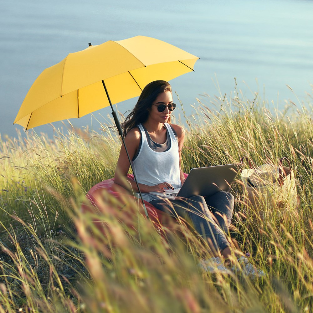 arretierbarer Unterstock, Bezug mit Lichtschutzfaktor UPF 50+, komfortables Tragefutteral, koffertauglich durch platzsparende Reisegröße, gastfreundlicher Durchmesser, auch als Regenschirm geeignet, exklusive Erdspieß (Art. 8939)