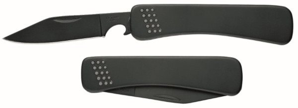 Einklappbares Vielzweckmesser mit schönem Lochdesign. 70mm Klinge, antihaftbeschichtet, VPE 120. Kapselheber, Nylonetui, Designkarton