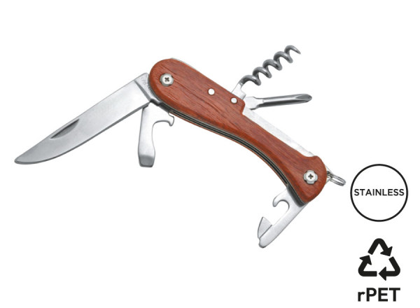 Multifunktionsmesser aus sehr widerstandsfähigen Edelstahlkomponenten (2CR13). Griff aus Padoukholz. Sieben Funktionen: Messer, Flaschenöffner, Dosenöffner, Schlitzschraubendreher 4 mm und 2 mm, Korkenzieher mit vier Spiralen, Kreuzschlitzschraubendreher, Ring. Wird in einem melierten grauen Etui aus RPET geliefert.