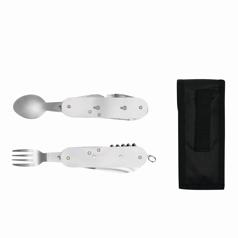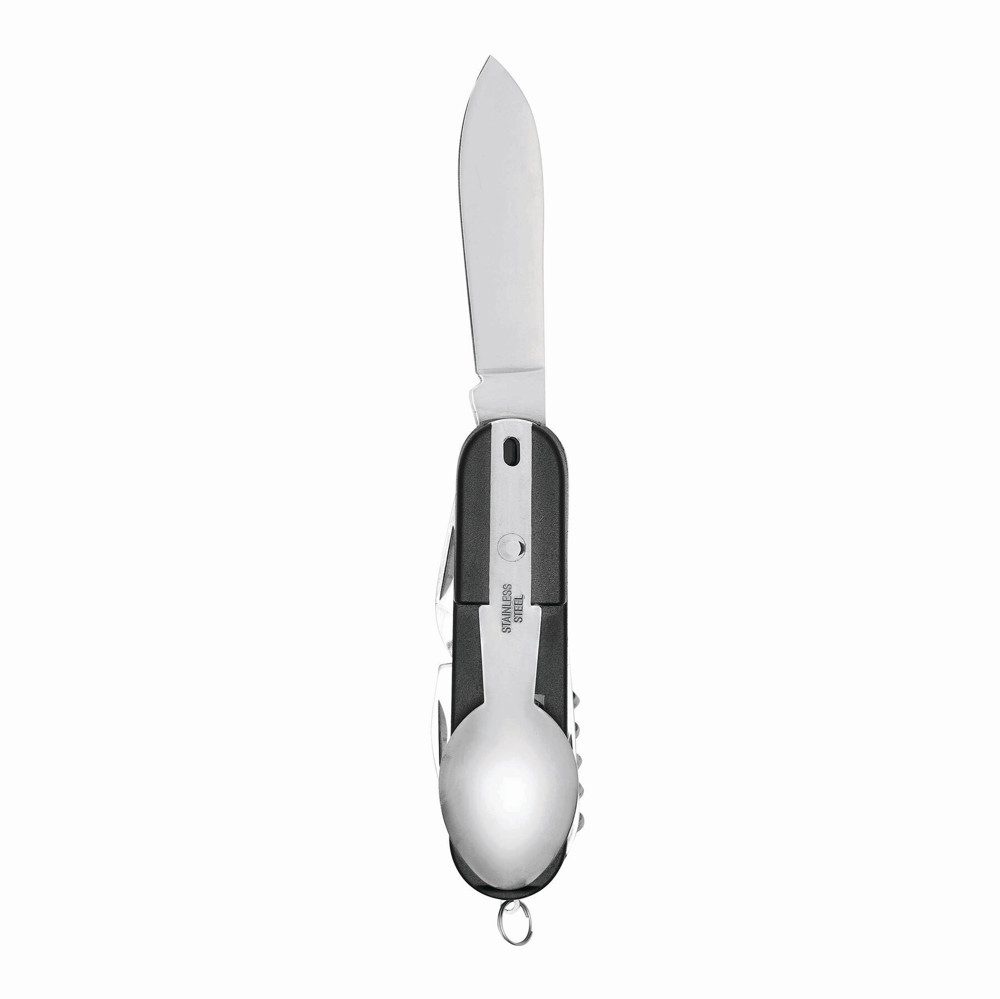 Edelstahl-Multifunktionswerkzeug WILDLIFE: mit ausklappbarem Messer, Flaschen- und Dosenöffner, Entschupper und Korkenzieher, ausziehbarer Gabel und Löffel, mit Schlüsselring, in Tasche mit integrierter Gürtelschlaufe und Klettverschluss – ideal für Camping, Picknick und Outdooraktivitäten, in Box