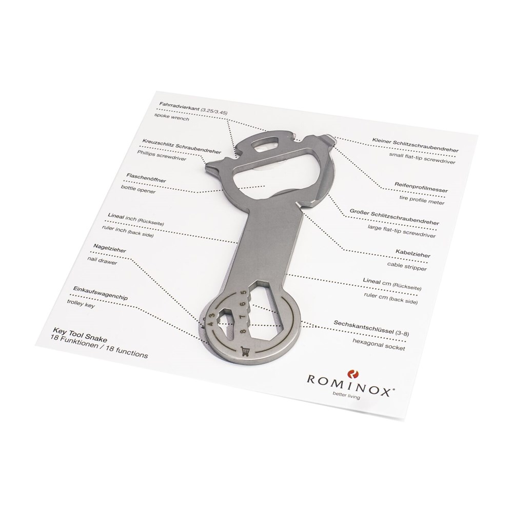 Multitool (aus robustem Edelstahl) für den Schlüsselbund inkl. Funktionsbeschreibung und Standard-Kartonverpackung, kundenindividuelle Verpackung und Funktionsbeschreibung ab 100 Stück möglich. In verschiedenen Standarddesigns verfügbar. Key Tool als Schlüsselanhänger mit 19 Funktionen: 6 Sechskantschlüssel, 2 Speichenvierkant, 2 Schlitzschraubendreher, 1 Flaschenöffner, 1 Kreuzschlitzschraubendreher, 1 Nagelzieher, 1 Einkaufswagenlöser, 1 Kabelzieher, 1 Zentimeter Lineal, 1 Inch Lineal, 2 Reifenprofilmesser (1,6 und 4 mm) - ab 3.000 Stück auch als Sonderproduktion mit individueller Key Tool Form möglich. Sprechen Sie uns an!