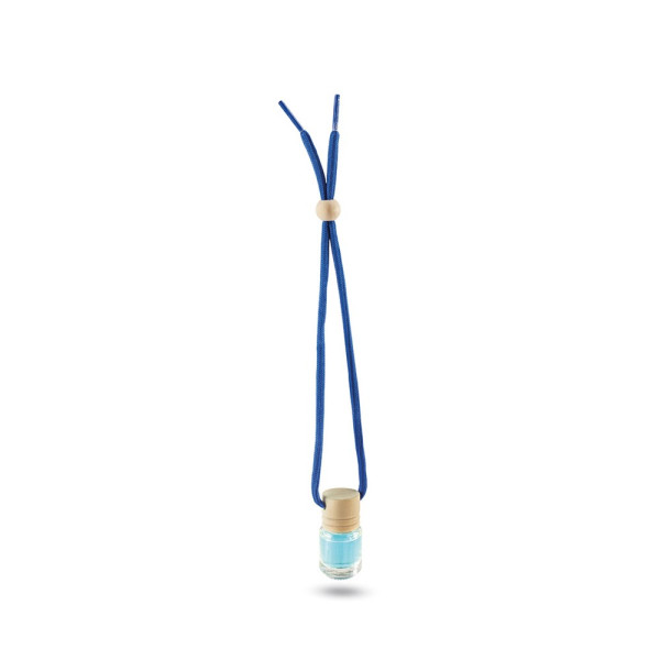 Auto-Lufterfrischer mit Oceanduft in 5 ml Glas mit Holzdeckel und farblich passender Kordel zum Aufhängen mit Kordelstopper aus Holz. Präsentiert in einer individuellen PVC-Box.