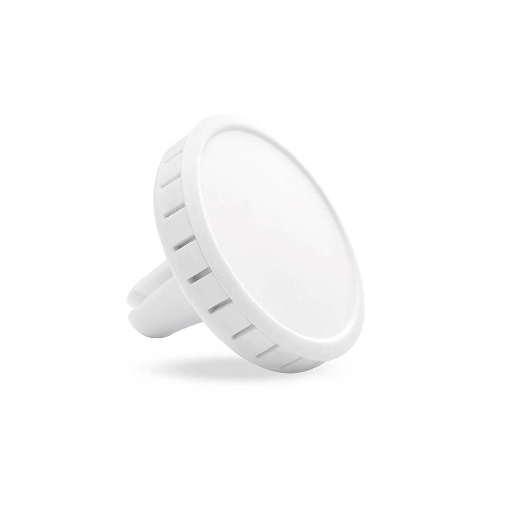 Lufterfrischer mit Zitronenaroma für die Befestigung an der Auto-Lüftung. Mit Gehäuse in fröhlichen Farben und spezieller Stanzung für die Personalisierung mittels Doming / 3D Gel-Aufklebern.