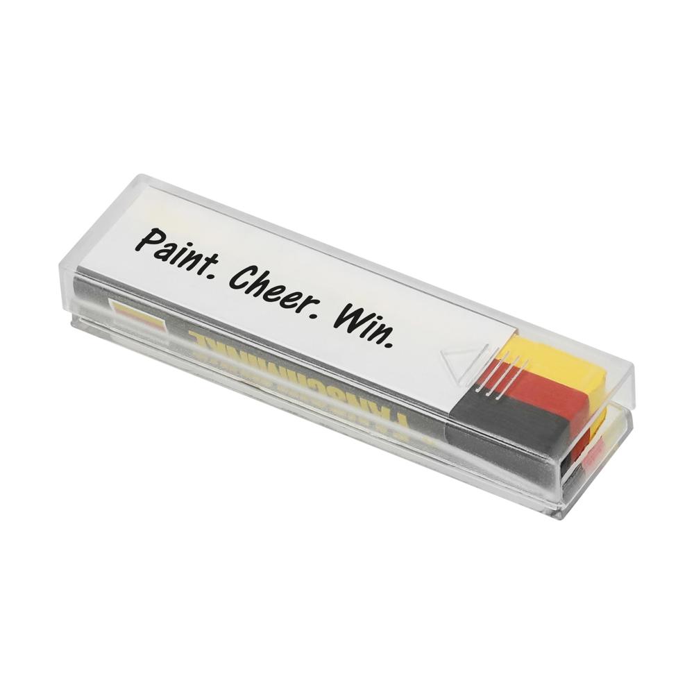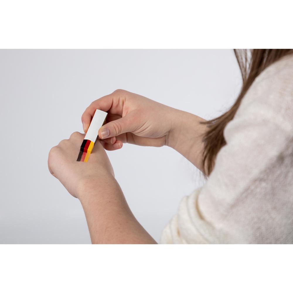 Fanschminke im Deutschlandfarben-Design. Leichte Handhabung: Ansetzen, Strich ziehen und die Deutschlandfahne ist perfekt. Von der Haut leicht abwaschbar.