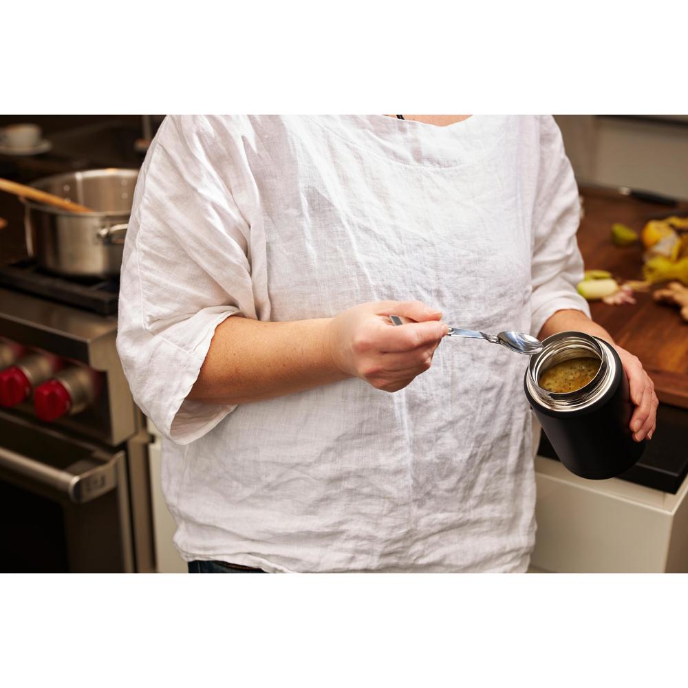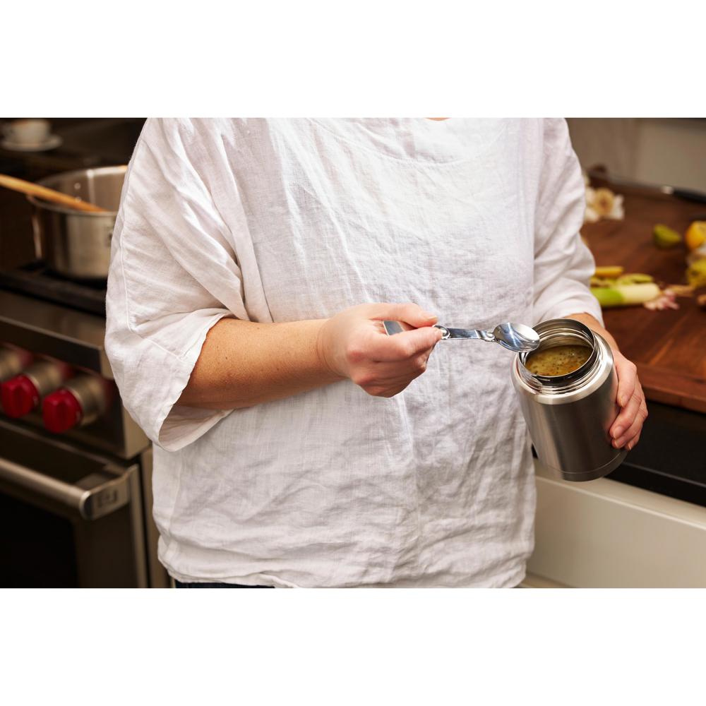 Der Suppenbehälter "Take Away" ist ideal für den Transport sowie die Aufbewahrung von Lebensmitteln aller Art - insbesondere Suppen - geeignet. Das Unterteil besteht aus doppelwandigem Edelstahl. Durch die Vakuumierung wird die Temperatur im Inneren des Behälters lange konstant gehalten. Verschlossen wird der Behälter mit einem Innen- und einem Außendeckel. Beide haben einen Schraubverschluss. Der Innendeckel verfügt über eine Silikondichtung und macht das Behältnis auslaufsicher. Inkl. faltbarem Löffel, welcher im Innendeckel aufbewahrt werden kann. Füllmenge: 0,5 Liter.