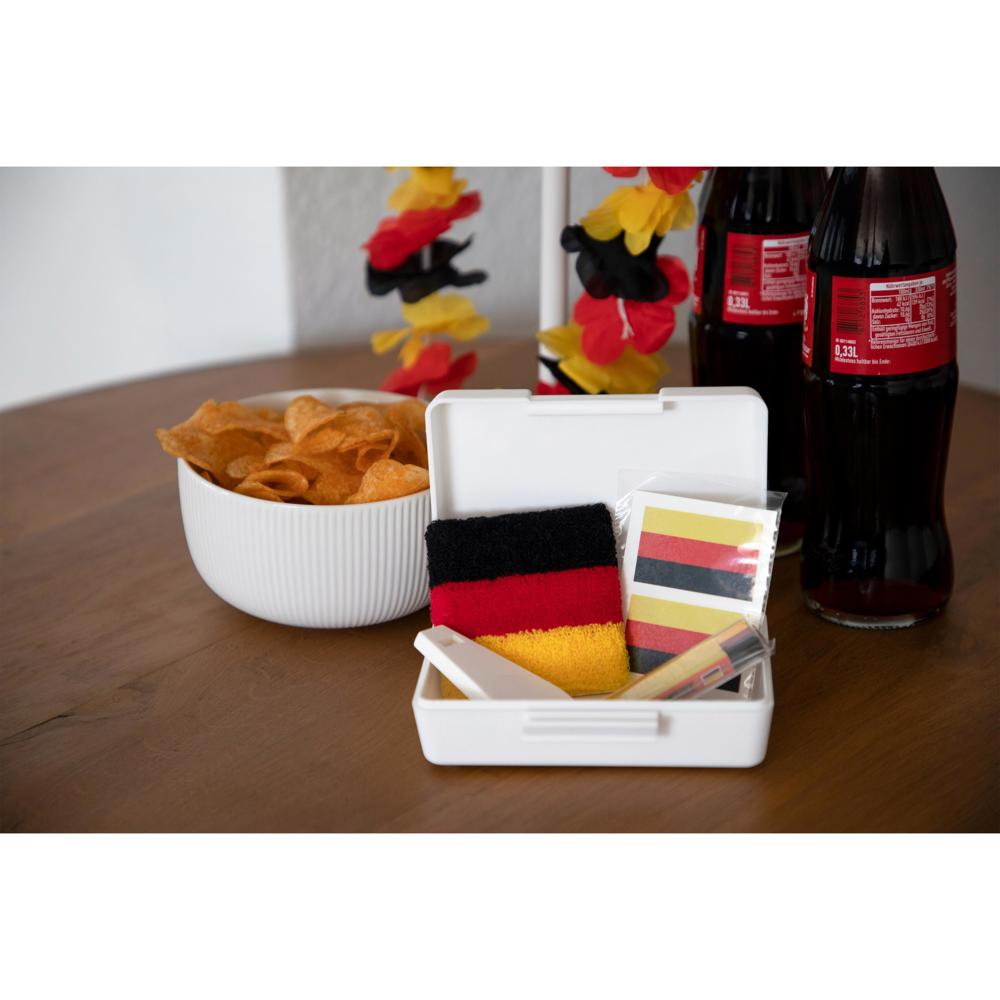 Rechteckige, praktische Box aus Kunststoff mit Klickverschluss, der sich auch ganz leicht mit einer Hand öffnen lässt. Befüllt mit der Pfeife "Schlüsselanhänger" (03635), einer Fanschminke (07270), dem Schweißband "Nations-Germany" (07459) und Tattoo "Nations" (09373).