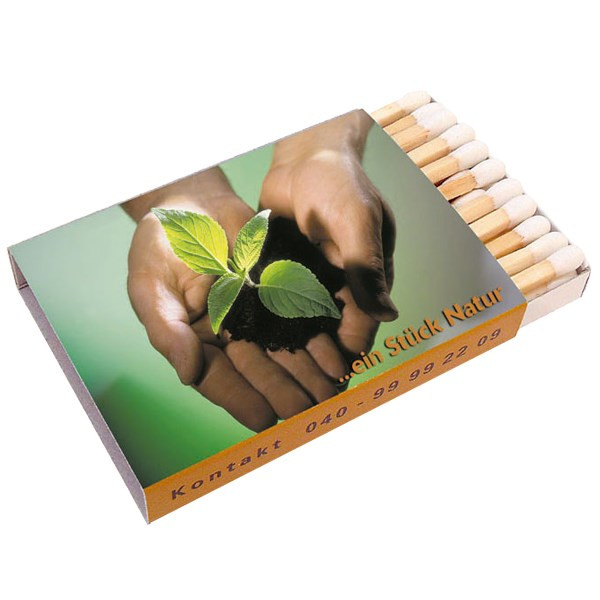 Streichholzschachtel Inhalt: ca. 30 Streichhölzer Maße: 56 x 41 x 10 mm³ Holzfarben: natur, schwarz, rot (auf Anfrage) Kopffarben: rot, orange, gelb, weiß, schwarz, grau, hellgrün, dunkelgrün, hellblau, blau, dunkelblau, pink, bordeaux, hellbraun, dunkelbraun, violett (auf Anfrage) Preise inkl. 1 Druckfarbe aus der Euroskala/CMYK (ohne Sonderfarben). Jede weitere Druckfarbe gegen Aufpreis. Schwarze/farbige Hölzer gegen Aufpreis. Freie Wahl der Kopffarbe ohne Aufpreis.