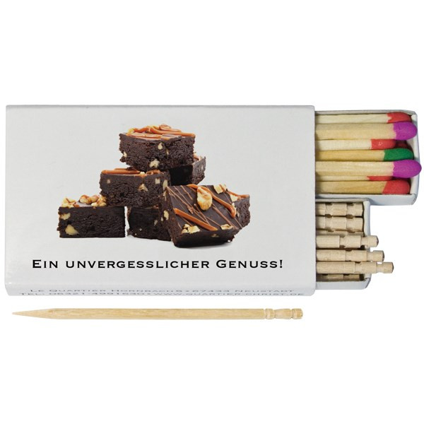 Zahnstocher Inhalt: ca. 10 Zahnstocher Maße: 56 x 36 x 9 mm³ Holzfarben: natur, schwarz, rot (auf Anfrage) Kopffarben: rot, orange, gelb, weiß, schwarz, grau, hellgrün, dunkelgrün, hellblau, blau, dunkelblau, pink, bordeaux, hellbraun, dunkelbraun, violett, gemischte Kopffarben (auf Anfrage) Preise inkl. 1 Druckfarbe aus der Euroskala/CMYK (ohne Sonderfarben). Jede weitere Druckfarbe gegen Aufpreis. Schwarze/farbige Hölzer gegen Aufpreis. Freie Wahl der Kopffarbe ohne Aufpreis.