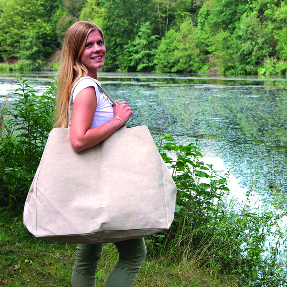 Die Tasche besteht aus Polyester-Canvas und verfügt über ein offenes Hauptfach, das mit einem Magnetknopf verschlossen wird. Sie ist mit einem Druckknopf verkleinerbar und hat eine kleine offene Innentasche. Mit einem Volumen von ca. 75 l bietet die Tasche viel Stauraum und Flexibilität.