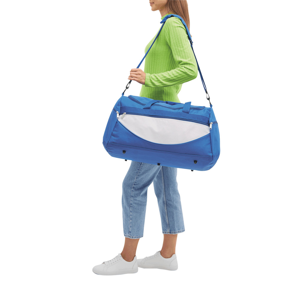 Sporttasche CHAMP: Reißverschluss-Hauptfach, farblich abgesetztes Reißverschluss-Vorfach, seitliche Reißverschlusstaschen, verstärkte Tragegriffe, verstell- und abnehmbarer Gurt mit Schulterpolster