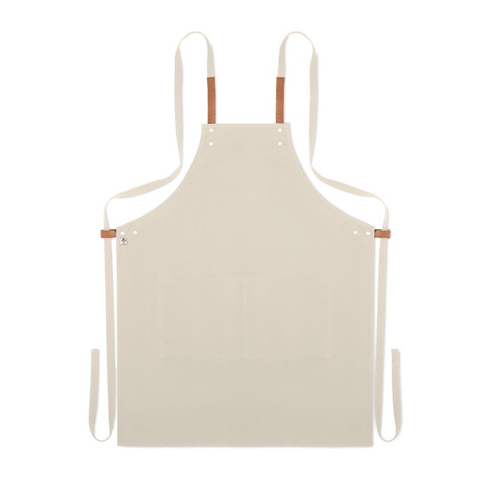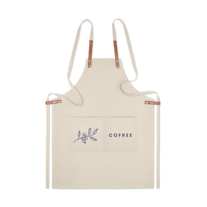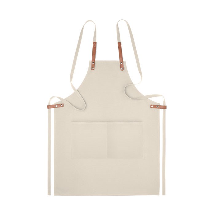 Küchenschürze mit verstellbarem Nackengurt und 2 Fronttaschen aus 340 g/m² Organic Cotton/Leinen. Lieferung in individuellem Karton.