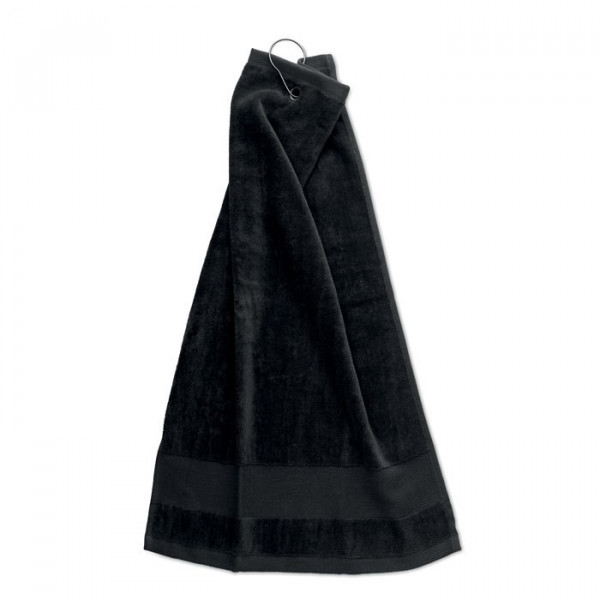 Golfhandtuch aus Baumwolle 350 g/m². Mit Öse und Haken zum Befestigen an Tasche oder Ausrüstung. Maße Handtuch: 40x60cm.