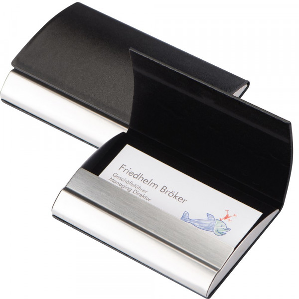 Stilvolles Visitenkartenetui aus Edelstahl mit einem Kunstlederbezug und Magnetverschluß. Die Werbung wird auf den Metallstreifen unterhalb der Öffnung gelasert.