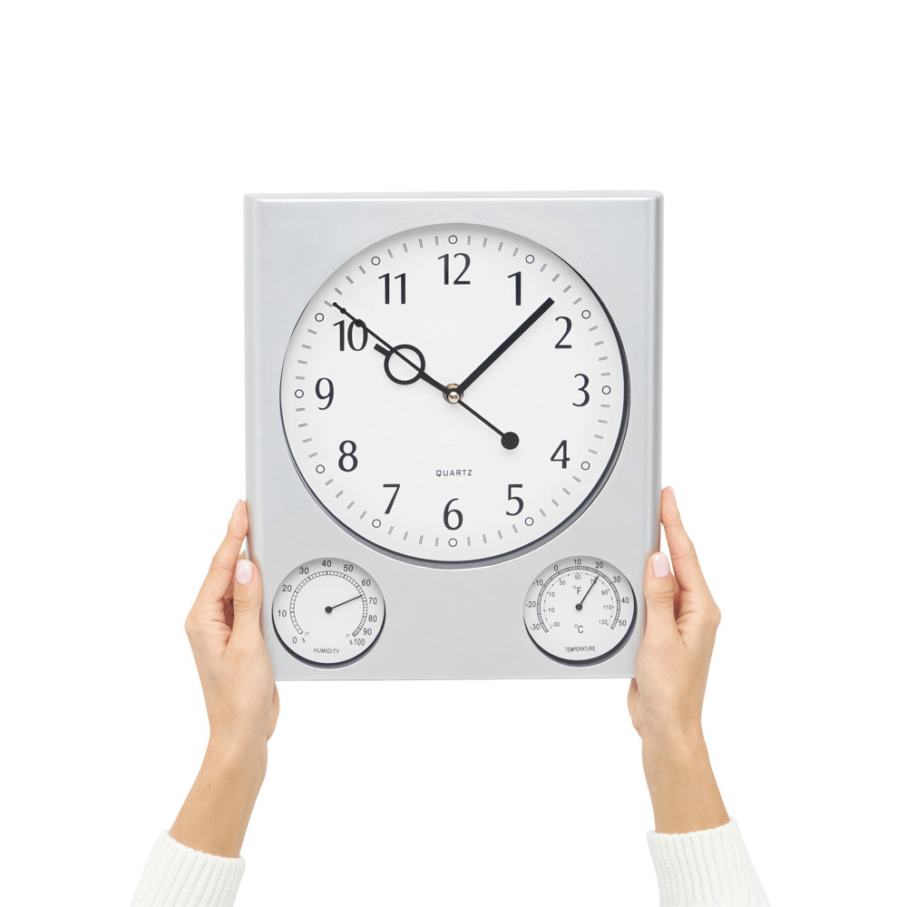 Rechteckige Wanduhr SATURN: mit Hygrometer und Thermometer, batteriebetrieben (1x AA Batterie nicht enthalten)